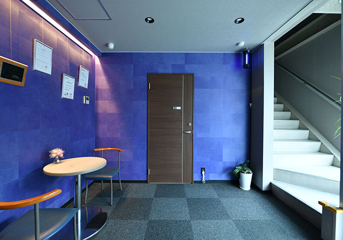 扉を開くと、ブルーを基調とした、落ち着いた雰囲気のエントランスがお出迎えします。